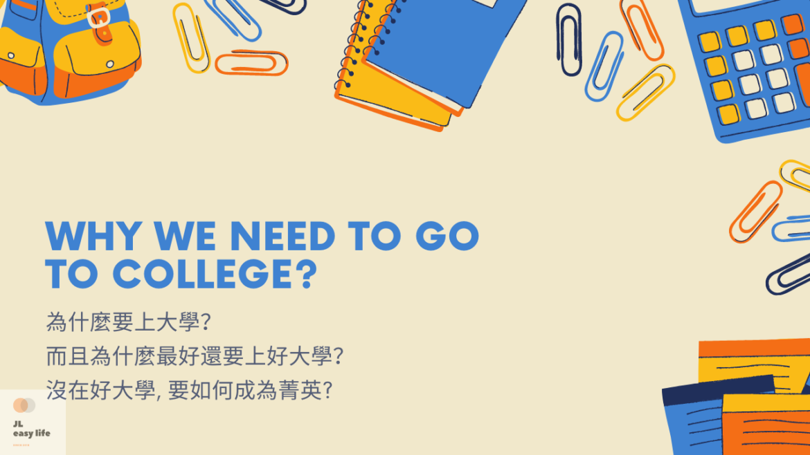 - 目的一:上大學成為菁英的可能性高很多, 若沒有成為菁英, 獲得幸福生活的可能性大很多